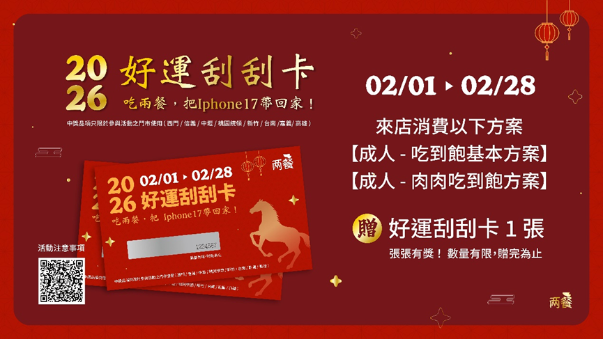 本次春節限定活動自 2026 年 2 月 1 日起至 2 月 28 日止,活動期間凡至兩餐指定門市,消費「成人吃到飽基本方案」或「成人肉肉吃到飽方案」,每位成人顧客皆可獲得 新春限定刮刮卡乙張,張張都有獎,數量有限,贈完為止。消費者在用餐後即可現場刮卡,為聚餐時光增添互動樂趣。